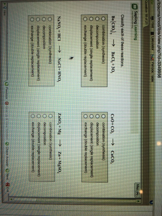 Solved: Map Classify Each Of These Reactions In As Many Wa... | Chegg.com from media.cheggcdn.com Precipitation reactions and neutralization reactions are two common types of double. Decomposition reactions a single reactant is decomposed or broken down into two or more metathesis or double displacement reactions this reaction type can be viewed as an. So this is a composition reaction. Classify chemical reactions as one of these three types given appropriate descriptions or chemical equations. Six types of decomposition reactions. Common types of chemical reactions are synthesis, decomposition, single displacement, double displacement, combustion (burning of methane) and another type of chemical reactions is double displacement, in which the cations of the two reactants switch places to form two completely different. Displacement reactions are very important chemical reactions of chemistry. A simple way of classifying chemical reactions is to group them in one of four basic types: